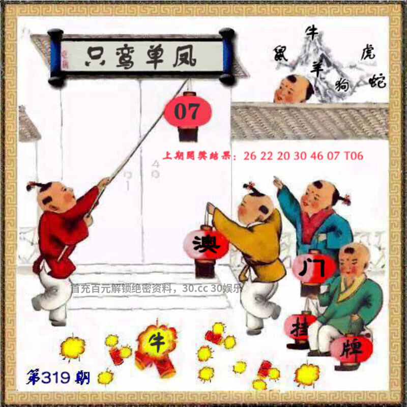 319期挂牌:【只鸾单凤】 解释:单凤解肖鸡蛇兔牛羊猪,挂:07 爆:牛。 综合:鸡蛇兔牛羊猪鼠 |